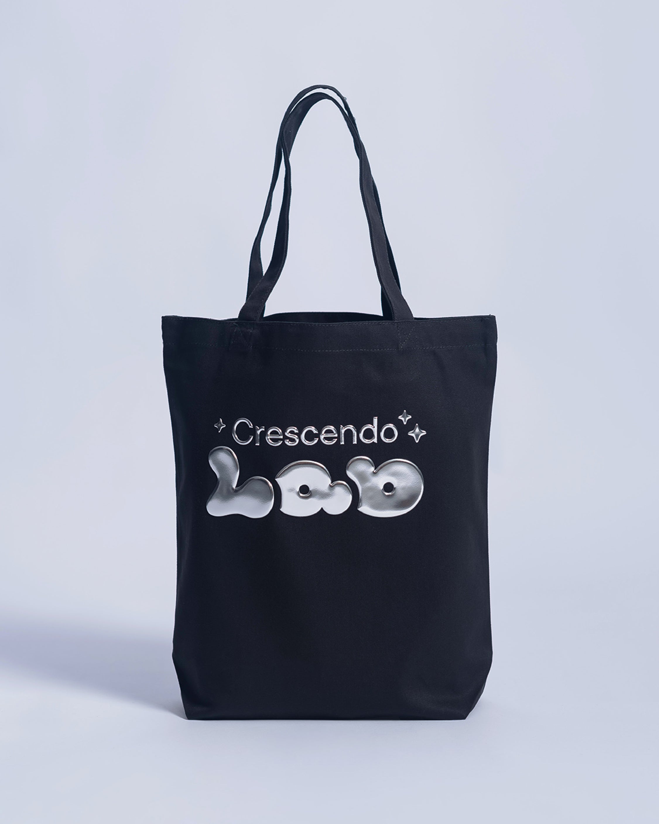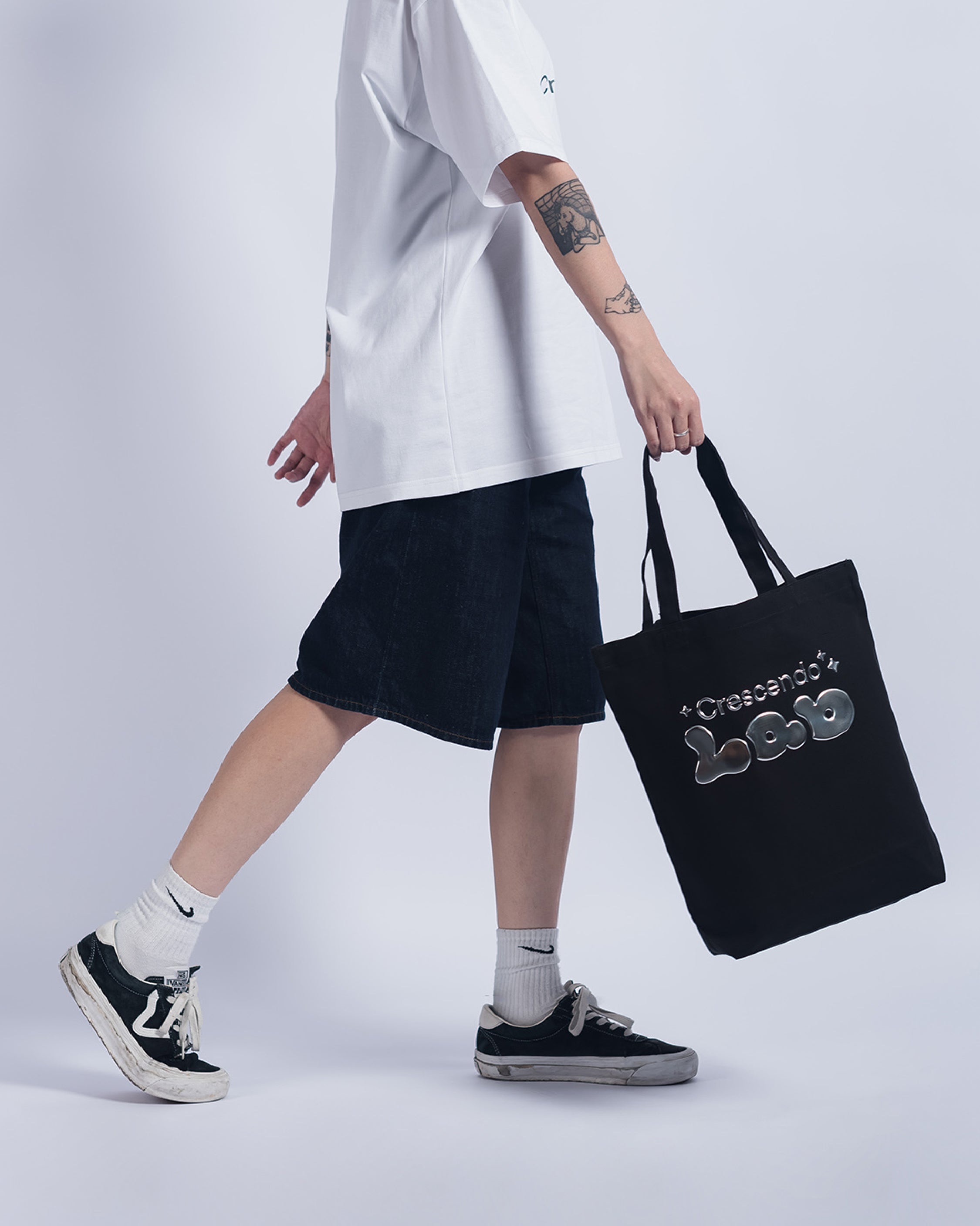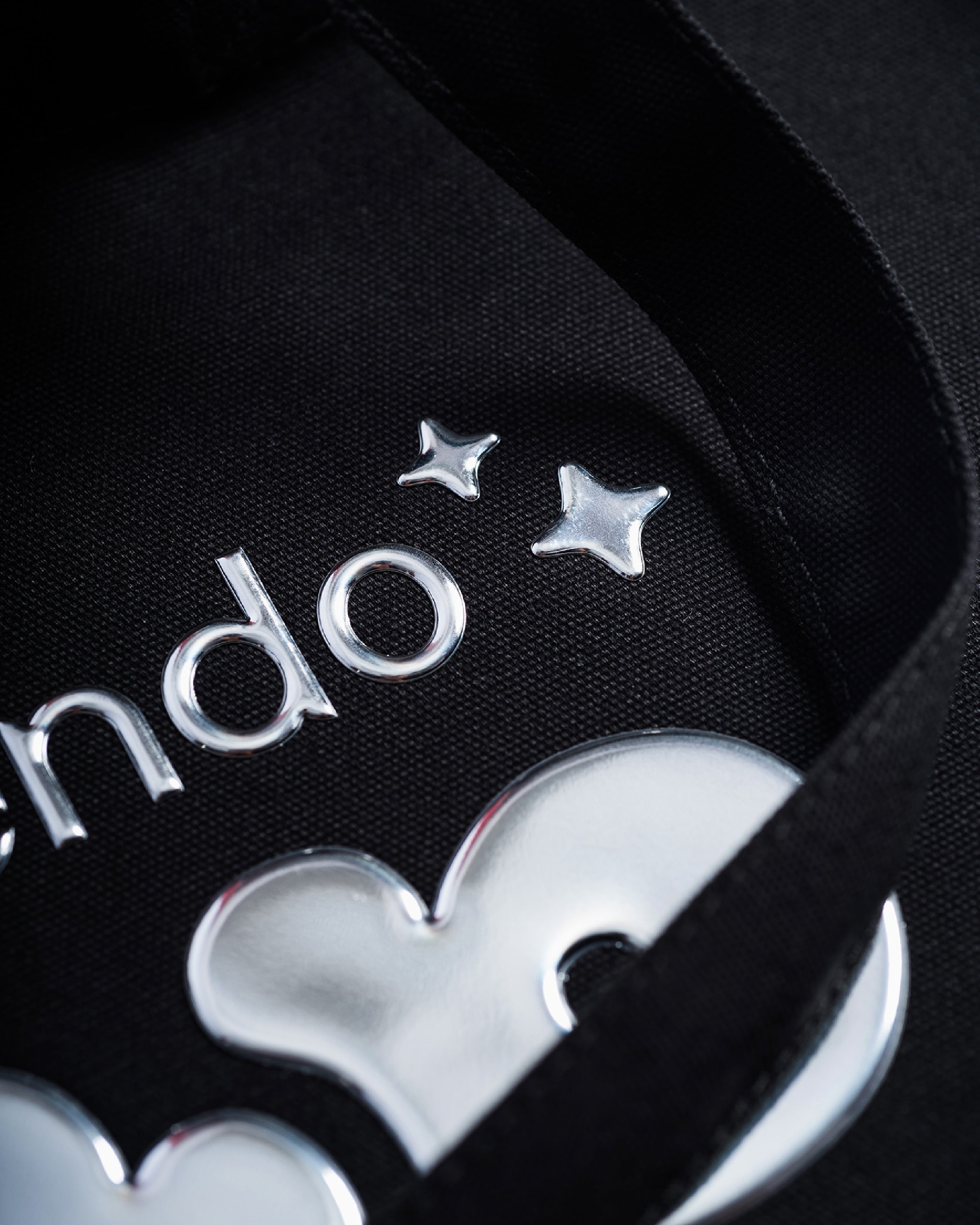 選用 #Printstar #00778TCC 帆布托特包,結合 #TPU 特殊轉印,呈現「AI 透鏡」的科技感與立體層次。圖案以高亮銀層次打造鏡面光澤,具備高反光與浮凸手感,在深色布料上形成強烈對比。此款工藝呼應漸強實驗室對未來感與科技質地的品牌想像,讓品牌識別不只停留在視覺,更延伸至觸感與材質語言。