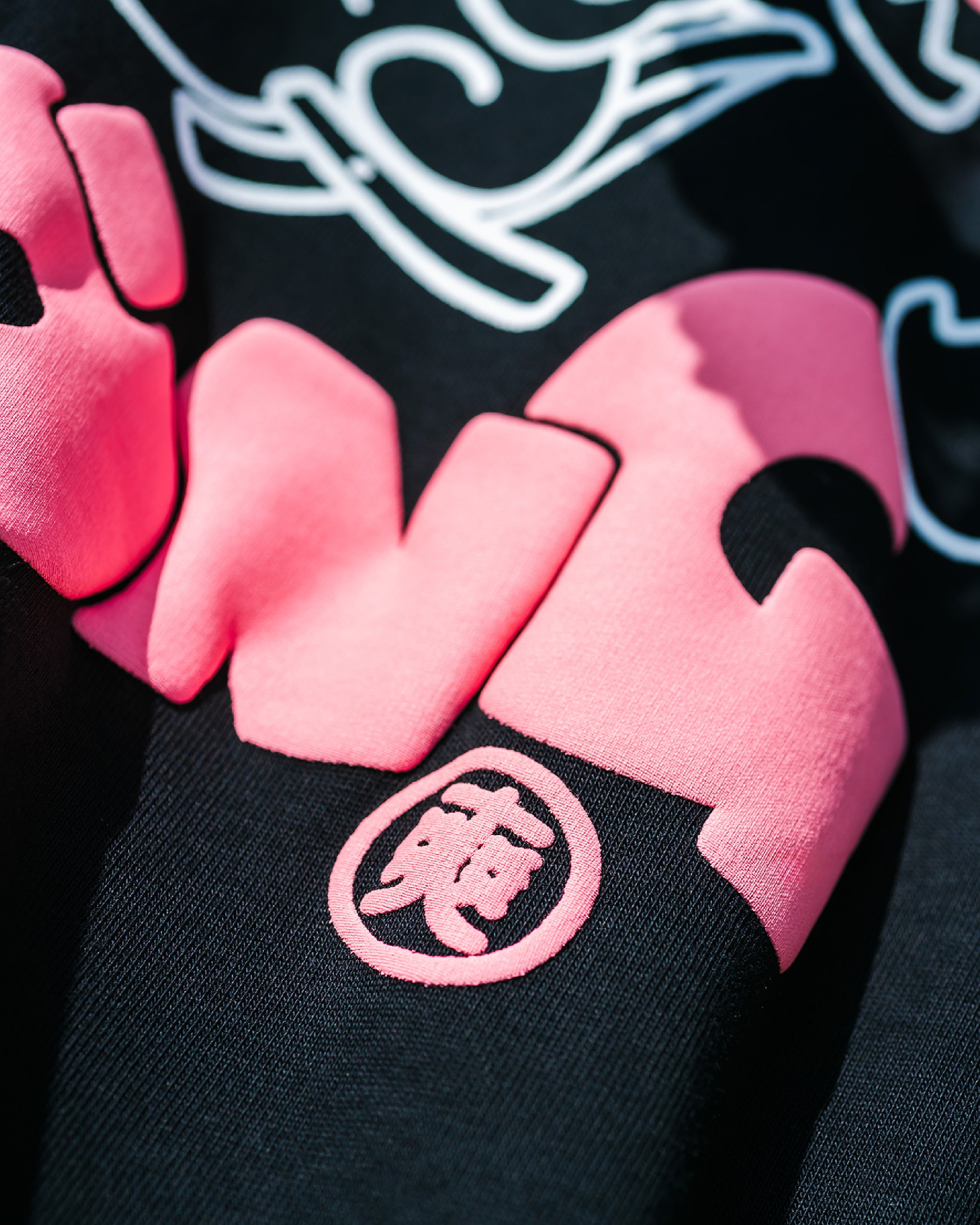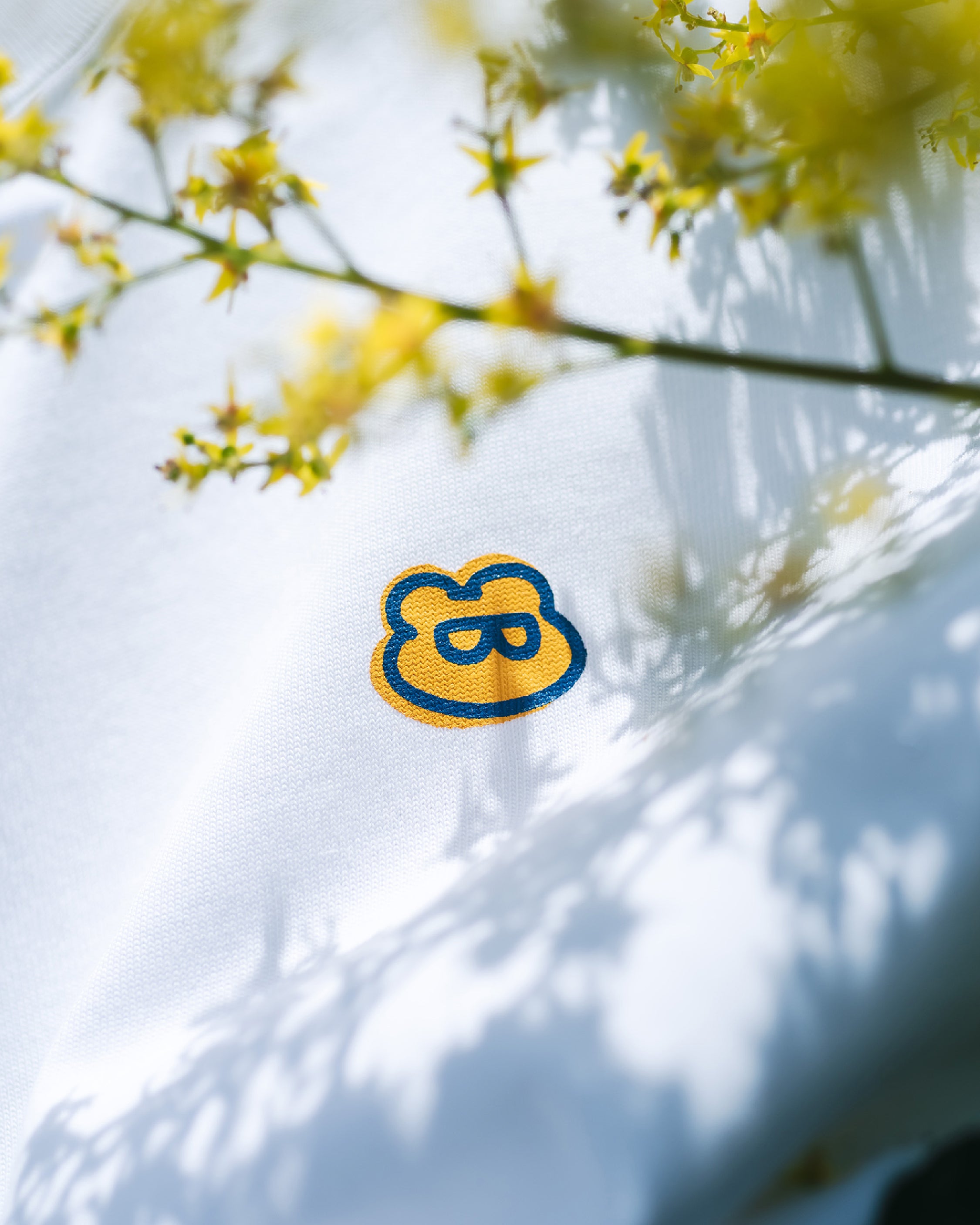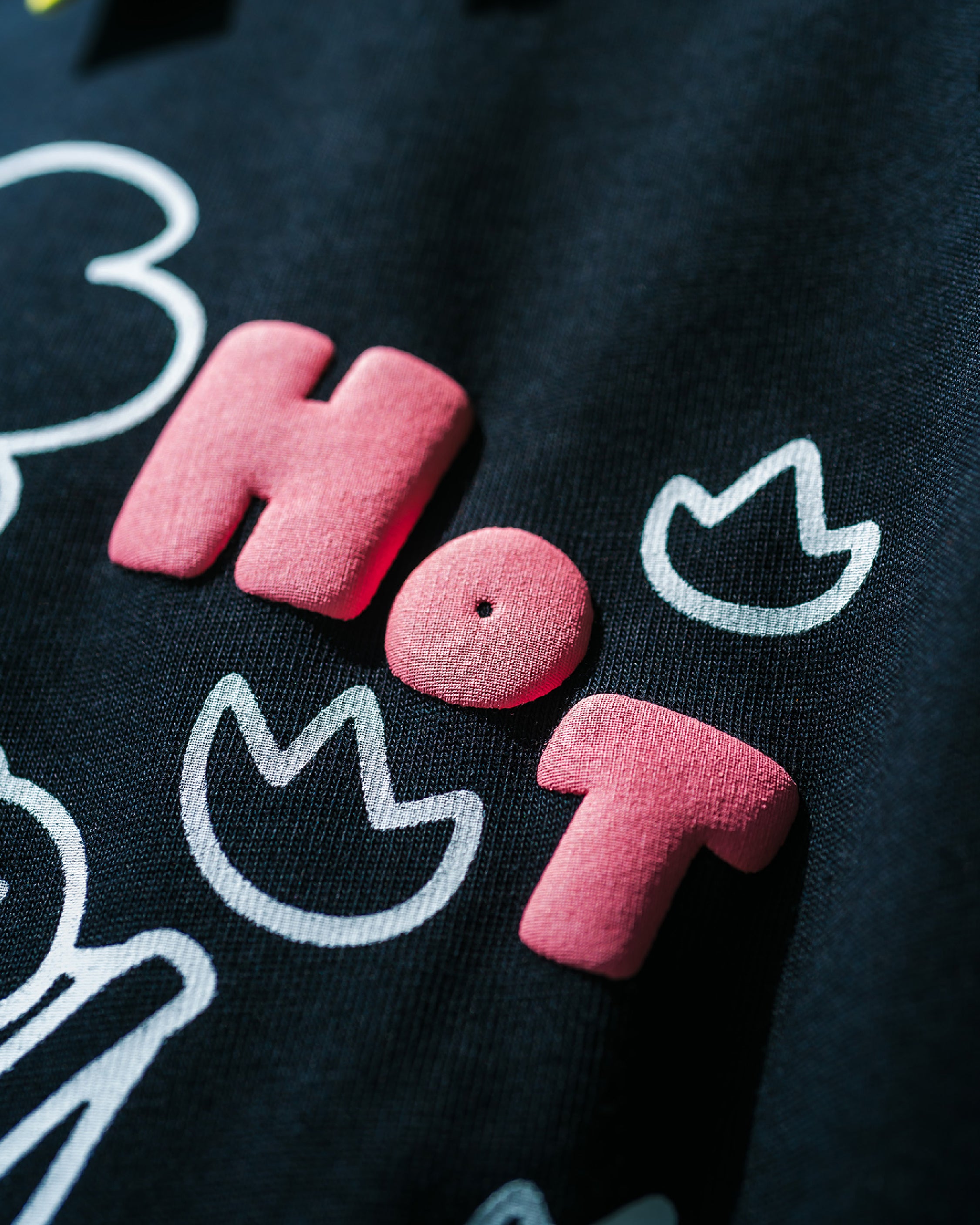 正面使用 #膠漿 #網版印刷 呈現高飽和度 LOGO,背面文字則採用 #發泡 #網版印刷,打造蓬鬆立體的視覺層次,彷彿圖像從布面中跳出,手感也更立體。圖樣再搭配 #膠漿 #網版印刷 疊層呈現,細節更豐富。最後車縫上 #裝飾標,讓品牌識別更加完整。