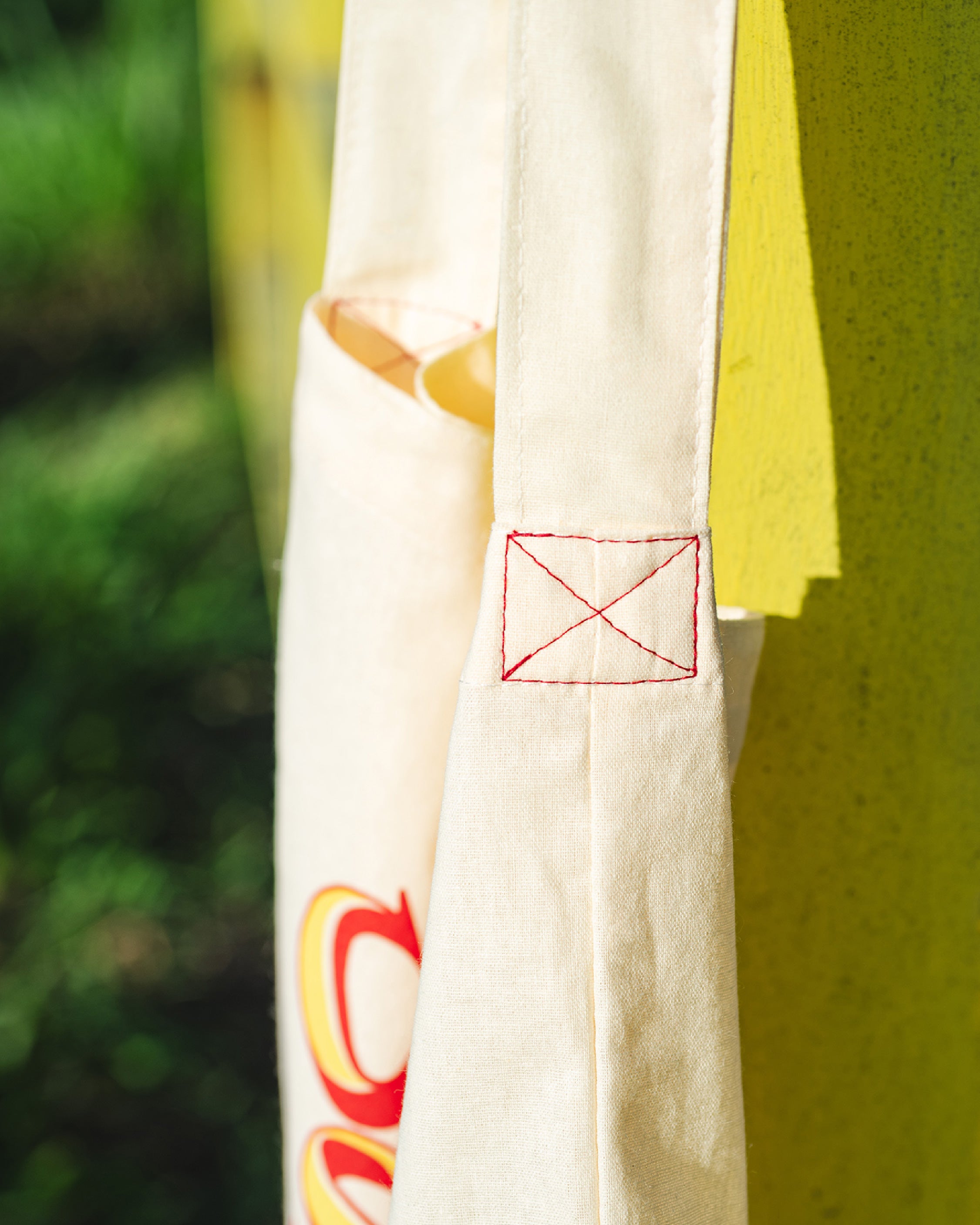 為確保長期承重的耐用度,提把連接處皆以 #交叉車縫 方式加固處理,強化整體結構的穩固性。視覺表現則採用經典的 #膠漿 #網版印刷 工藝,透過其特有的色彩覆蓋力與略帶手感的紋理,完美呈現出獨具匠心的復古氛圍與工藝質感。