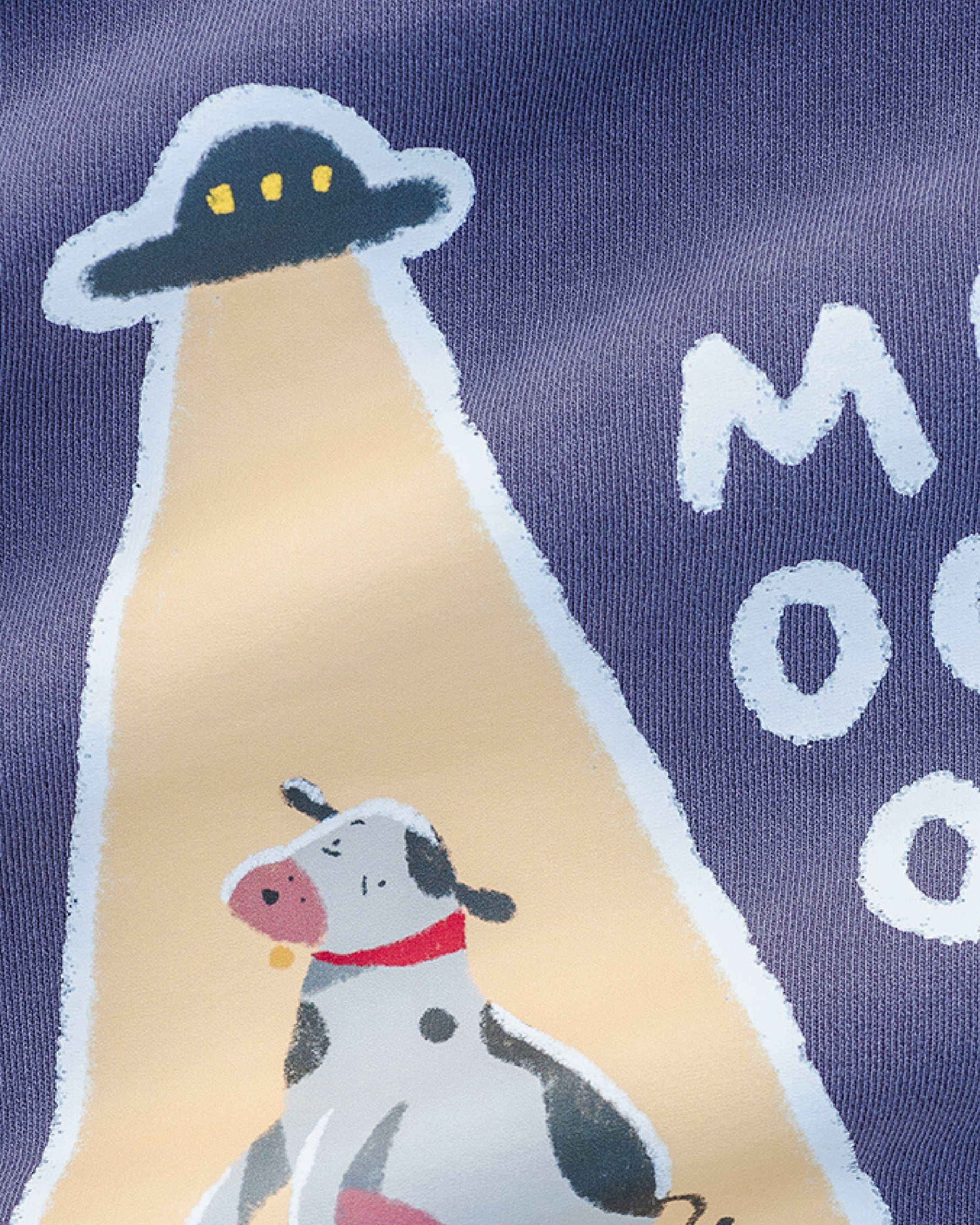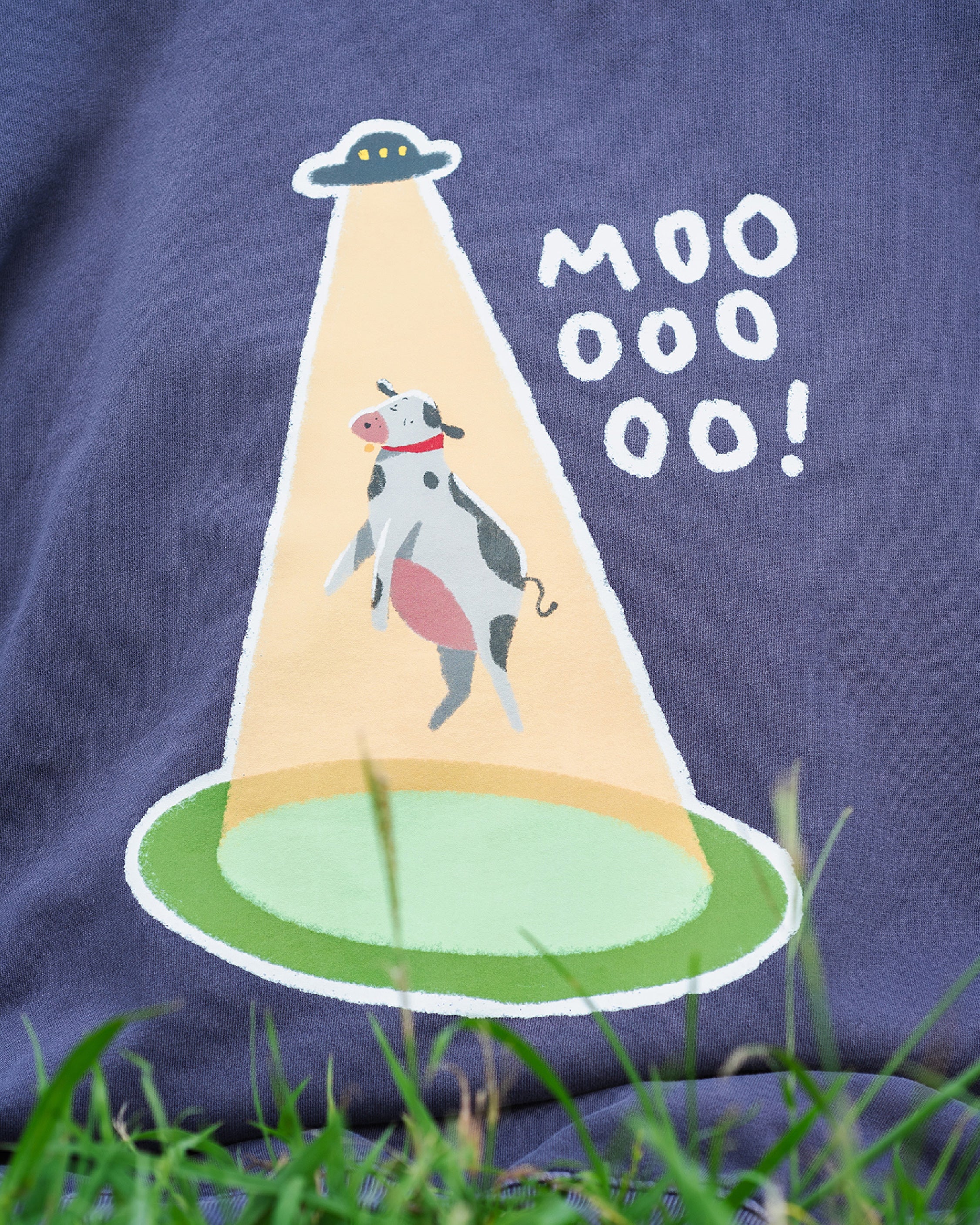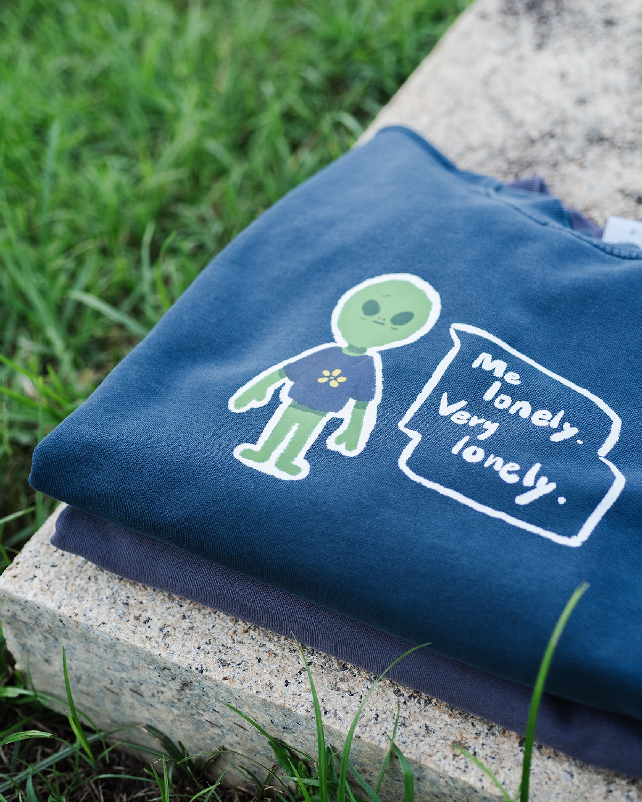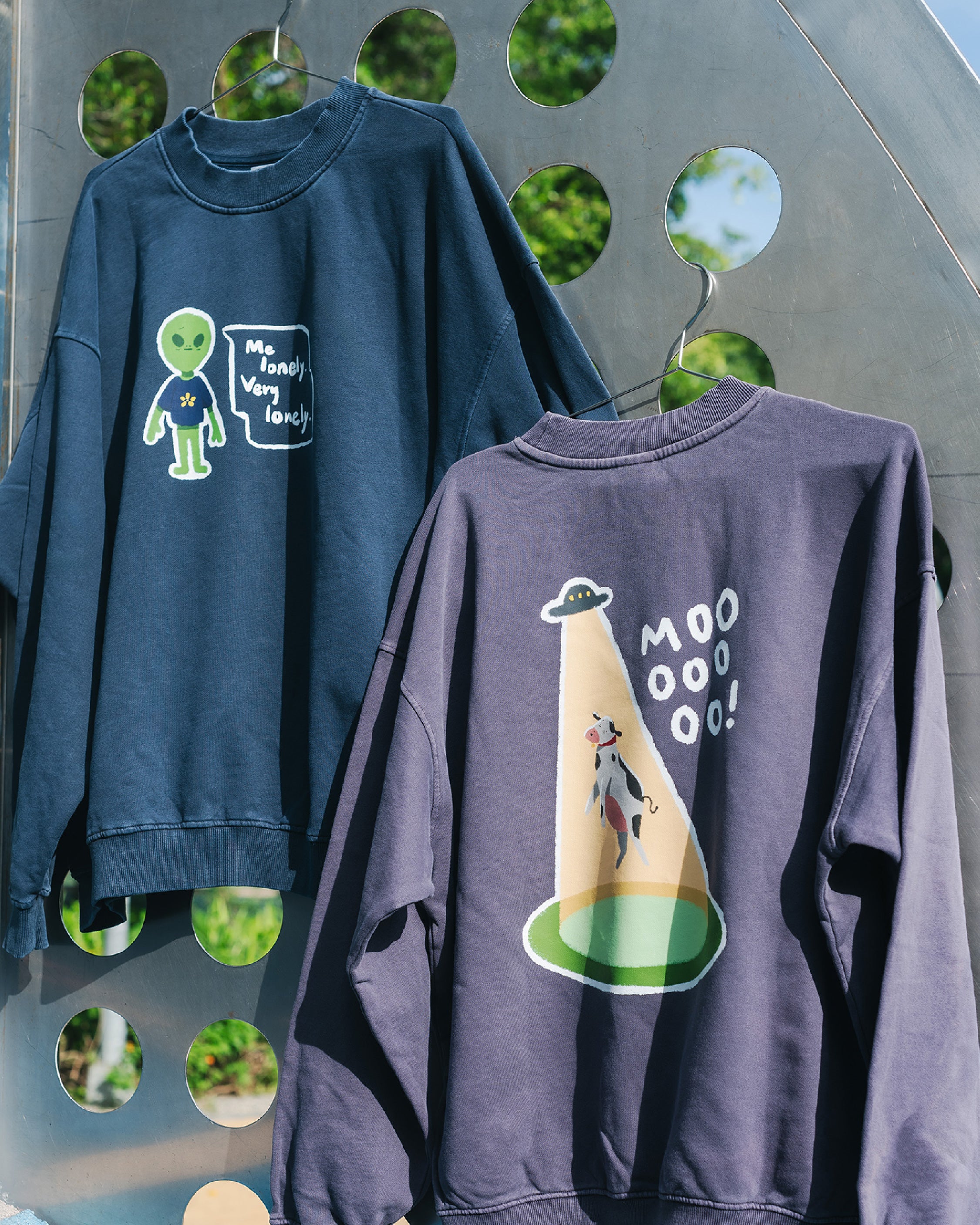 正面與背面圖案均以 #DTF熱轉印 工藝製作,細節飽滿清晰,色彩層次鮮明,能在深淺布底上同樣呈現穩定、飽和的印刷效果,將插畫中的趣味感完整保留。